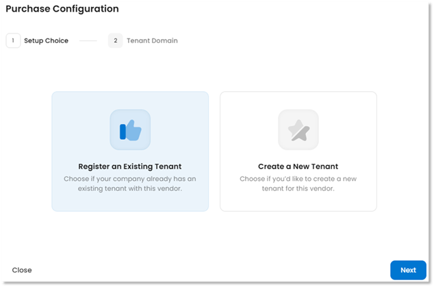 - On the Purchase Configuration page, select Register an Existing Tenant. Click the Next button to continue.