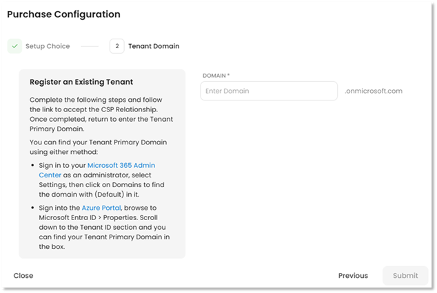 - On the Tenant Domain step, enter the default domain, which ends in .onmicrosoft.com, for the customer’s tenant.